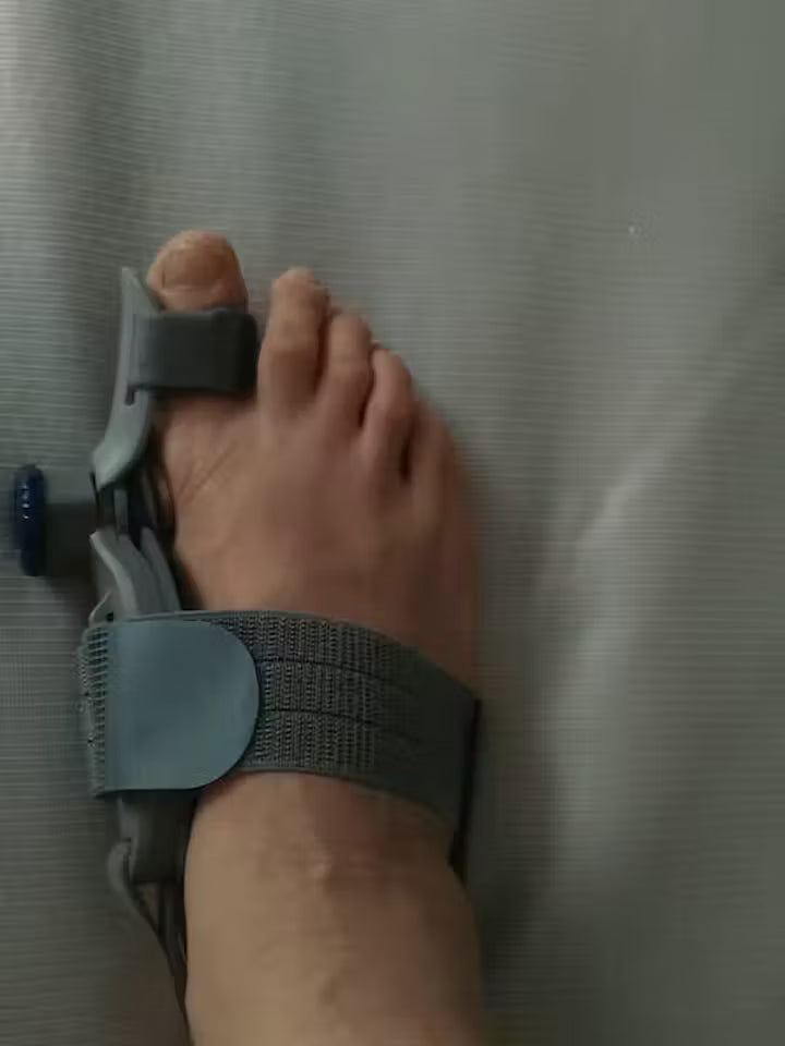 Erleben Sie, wie die flexible Zehenschiene Ihren Fuß stabilisiert, den großen Zeh sanft in eine natürlichere Position führt und Druck sowie Schmerzen bei Hallux Valgus deutlich reduziert.