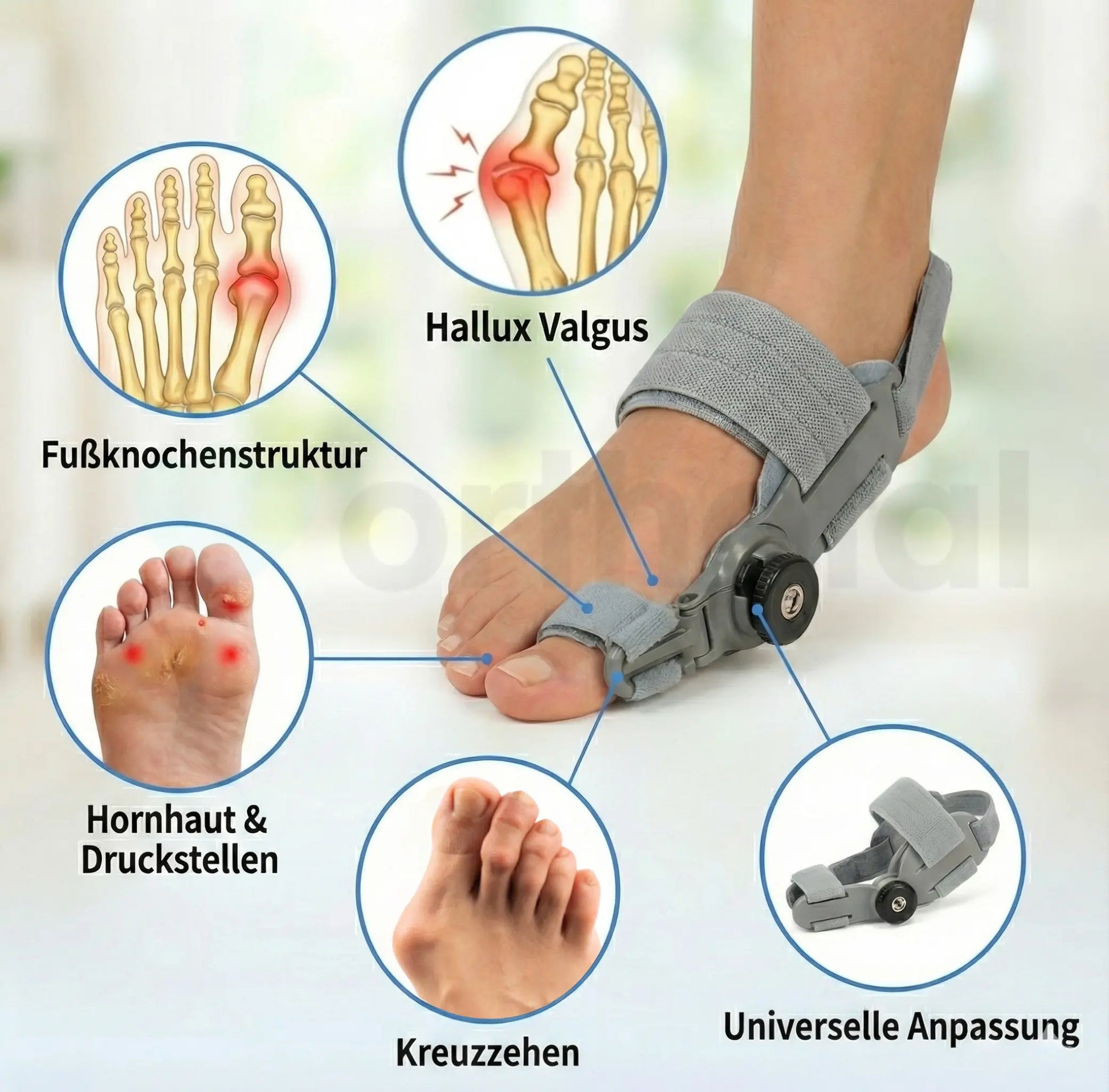 Eine bewährte nicht-chirurgische Lösung zur Unterstützung der Ausrichtung. Sanfte, aber effektive Ausrichtung des großen Zehs, die die Fußhaltung verbessert.